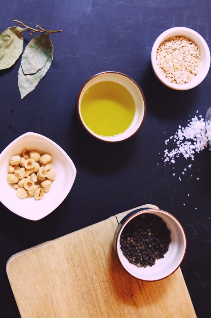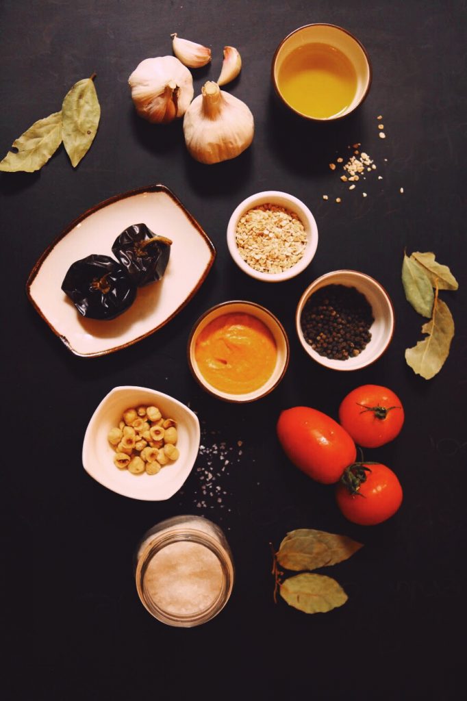 Como no le queremos poner nada de gluten, substituye el pan por avena, aprovecha que el horno está on fire, y tuéstala ahí mismo, y haz lo mismo con las avellanas y las almendras, vaya que lo cojas todo y lo metas al horno, los ingredientes secos se tostarán y los otros se asaran. Hasta aquí lo más complicado de la receta.