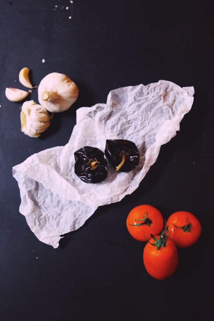 Pela los tomates y los ajos, y si se te ha quemado algo, quítalo también, en serio. Lo vamos añadiendo todo al mortero poco a poco, primero un ajo y después otro hasta que esté a tu gusto, pasa lo mismo con la sal, el medio vaso de aceite tiene que caer si o si, sino será un mazacote y no una salsa.
